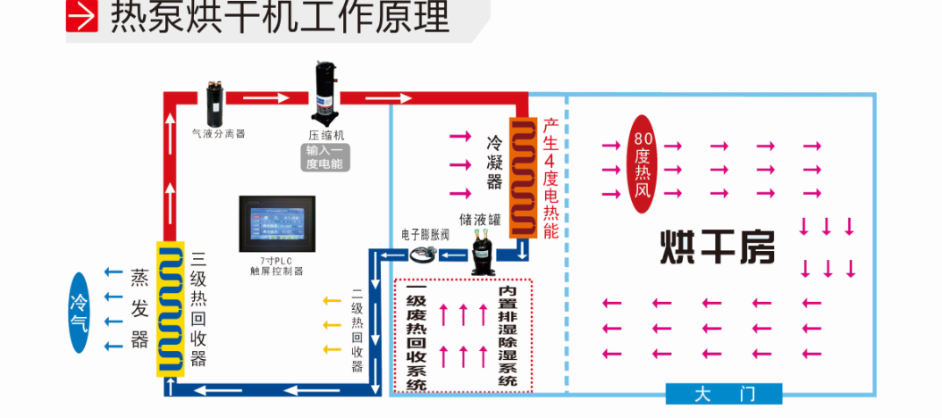 热泵烘干机的原理:热泵实质上是一种热量提升装置,高温热泵烘干机组利用逆卡诺原理,从周围环境中吸取热量,并把他传递给被加热的对象(温度较高的物流)其工作原理与制冷机相同,都是按照逆卡诺循环工作的,所不同的只是工作温度范围不一样。